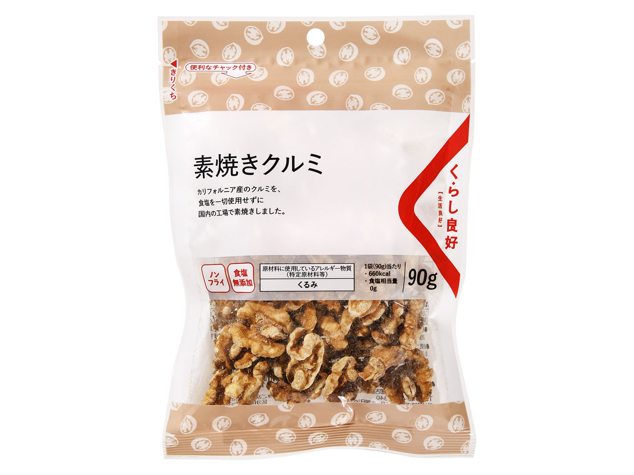 カリフォルニア産のクルミを、 食塩を一切使用せずに 国内の工場で素焼きしました。 おやつやおつまみに。 手づくりお菓子やパン、サラダの トッピングにもおすすめです。