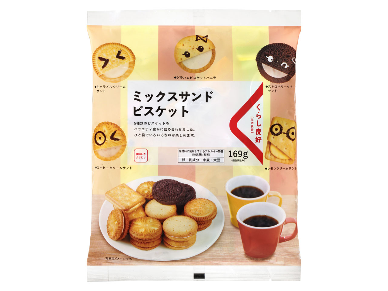 5種類のビスケットを 詰め合わせたお徳用パック ・グラハムビスケットバニラ ・レモンクリームサンド ・ストロベリークリームサンド ・コーヒークリームサンド ・キャラメルクリームサンド